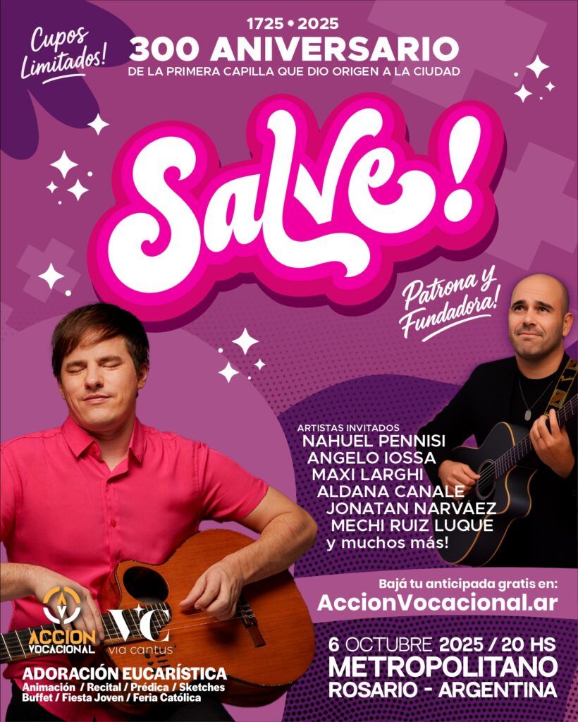 Salve! 2025 — Lo mejor está por venir El festival católico que hace bajar el cielo a la tierra vuelve a Rosario. En el Salón Metropolitano (Alto Rosario) nos encontramos para celebrar a María y a Jesús Eucaristía con todo el pulso de una gran noche: Adoración Eucarística, feria católica, recital/animación con artistas nacionales e […]